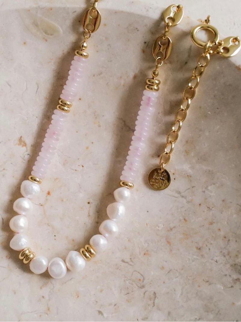 Krystal 招人氣招桃花能量項鍊! ♥Materials: 粉色水晶 淡水珍珠 銅鍍金 Pink Crystal Fresh Water Pearl 18k gold plated ♥Size: Length 項鍊長約44cm Extension 延長鍊5.3cm