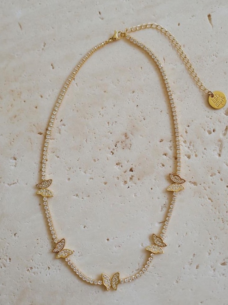Tiny little butterfly with crystal on top! It is recommended to keep the necklace in shape not to fold it as it is very fragile! ♥Materials: Copper with 18k gold plated European Crystal ♥Size: Length: 34cm+8cm