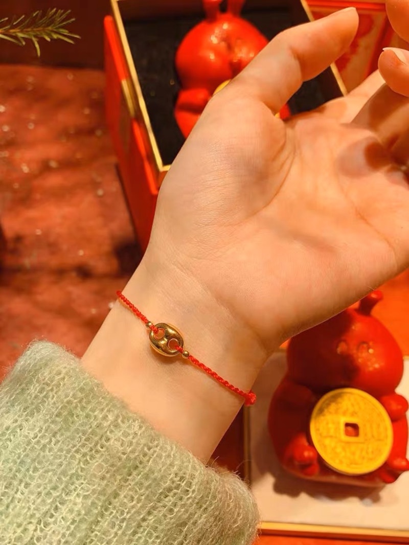 18k gold piggy bracelet ♥Materials: 純18k金墜飾與彩色棉繩 Pure 18k solid gold with color cotton straps