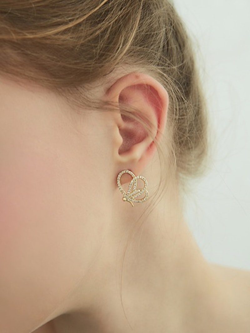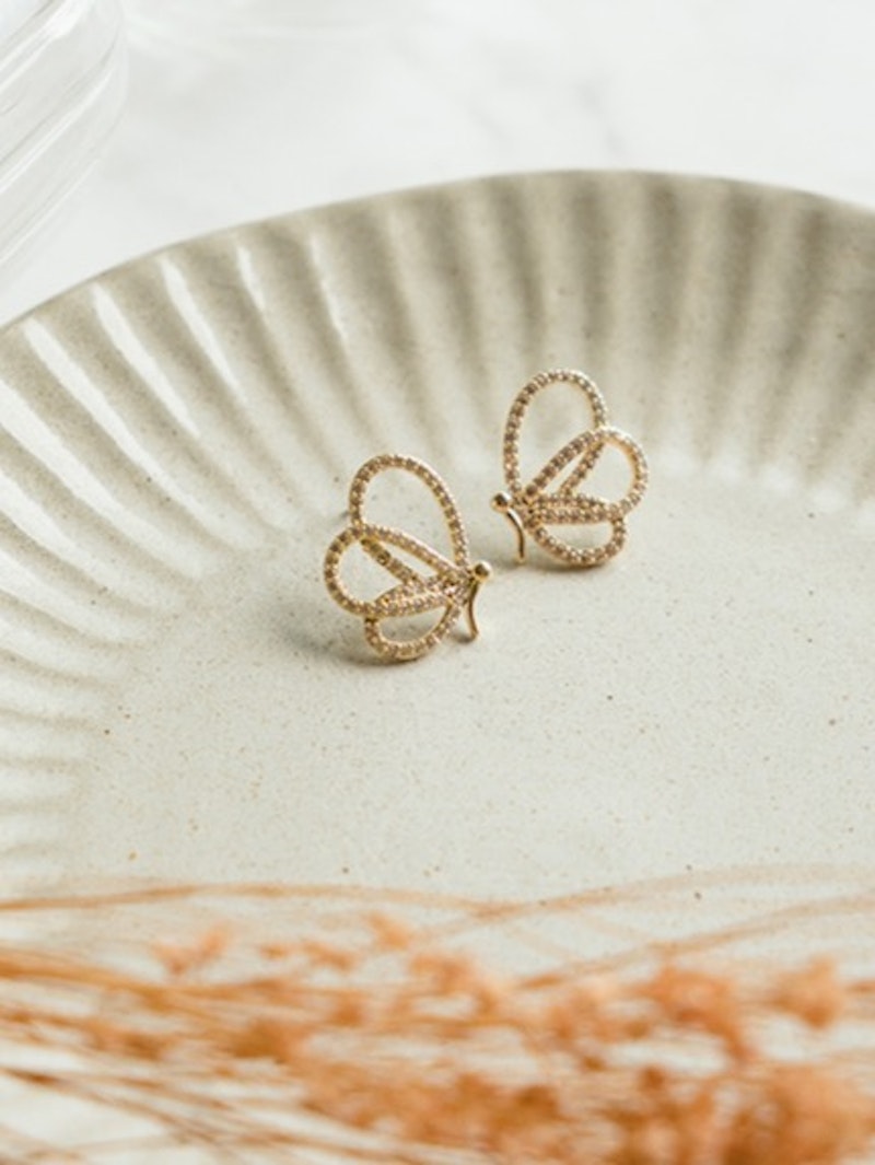 亮鑽蝴蝶。銀針耳環 商品材質: 14K金電鍍銅/鋯石 耳針材質: S925 銀針 尺寸: 2.1x1.8cm