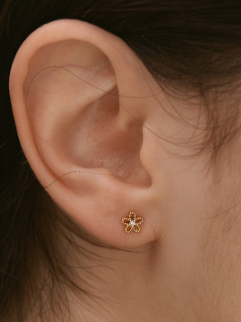 鏤空小花貼耳。銀針耳環 Material 商品材質: 14K金電鍍銅/鋯石 Ear Pin耳針材質: S925 銀針 Size尺寸: 0.6cm X 0.6cm