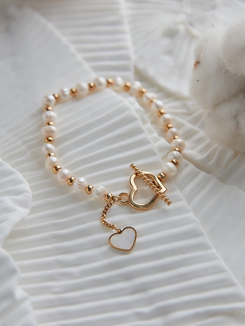 愛心T扣串接珍珠手環 商品材質: 18K金電鍍不鏽鋼/淡水珍珠 尺寸:鍊長約19cm Love T buckle series pearl bracelet Material: 18K gold electroplated stainless steel / freshwater pearl Size: chain length 19cm